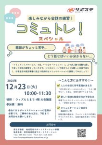 2025年12月9日 / 最終更新日時 : 2025年12月9日 髙橋花帆 サポステからのお知らせ 【講座のお知らせ】コミュトレスペシャル!コミュトレ!を2025年12月23日(火)に実施いたします。詳しくこちら からご確認ください。参加希望の方はサポステまでご連絡ください。是非ご参加お待ちしております。