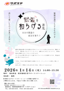 2026年1月6日 / 最終更新日時 : 2026年1月6日 髙橋花帆 サポステからのお知らせ 【講座】緊張を和らげる講座 【講座】緊張を和らげる講座を2026年1月14日(水)に実施いたします。詳しくは、こちら から確認ください!!対象者はサポステをご利用中の方です。参加希望の方はサポステまでご連絡ください。定員になり次第締め切らせて頂きます。
